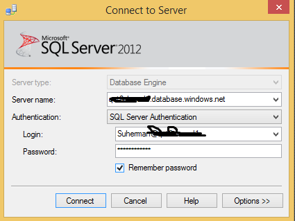 Untuk ini saya menggunakan SSMS 2012 yang kemudian saya koneksi kan ke database SQL Azure yang sudah saya buat sebelumnya :