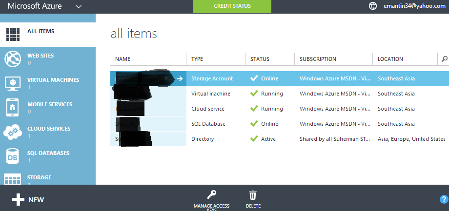 Namun kini pihak Microsoft sudah membuat perubahan yang sangat drastis terhadap antar muka dari Windows Azure ini. Jika tampilan windows Azure anda seperti gambar diatas dan ingin merubahnya ke tampilan yang baru yaitu dengan cara mengklik pada hyperlink Account anda yang ada di pojok kanan atas kemudian klik Menu Swtich to new portal.