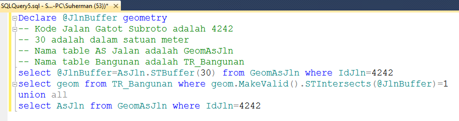 Kasus diatas dapat diselesaikan dengan menggunakan OGC Methods STBuffer di SQL Server spatial. misal kita mau cari bangunan-bangunan yang berada disekitar jalan Gatot Subroto Banjarmasin dalam jarak 30 meter dari AS Jalan, hal tersebut dapat diselesaikan dengan cara :