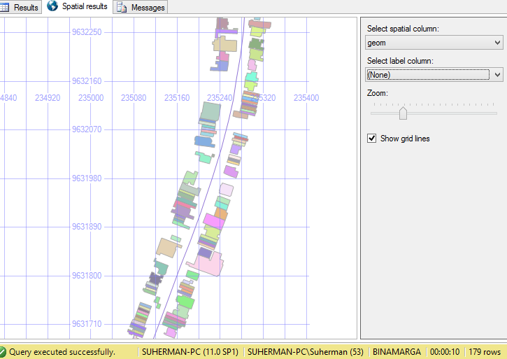 Sehingga didapat kan hasil pencarian sebanyak 178 Bangunan dengan hasil visualisasi query spatialnya seperti berikut :